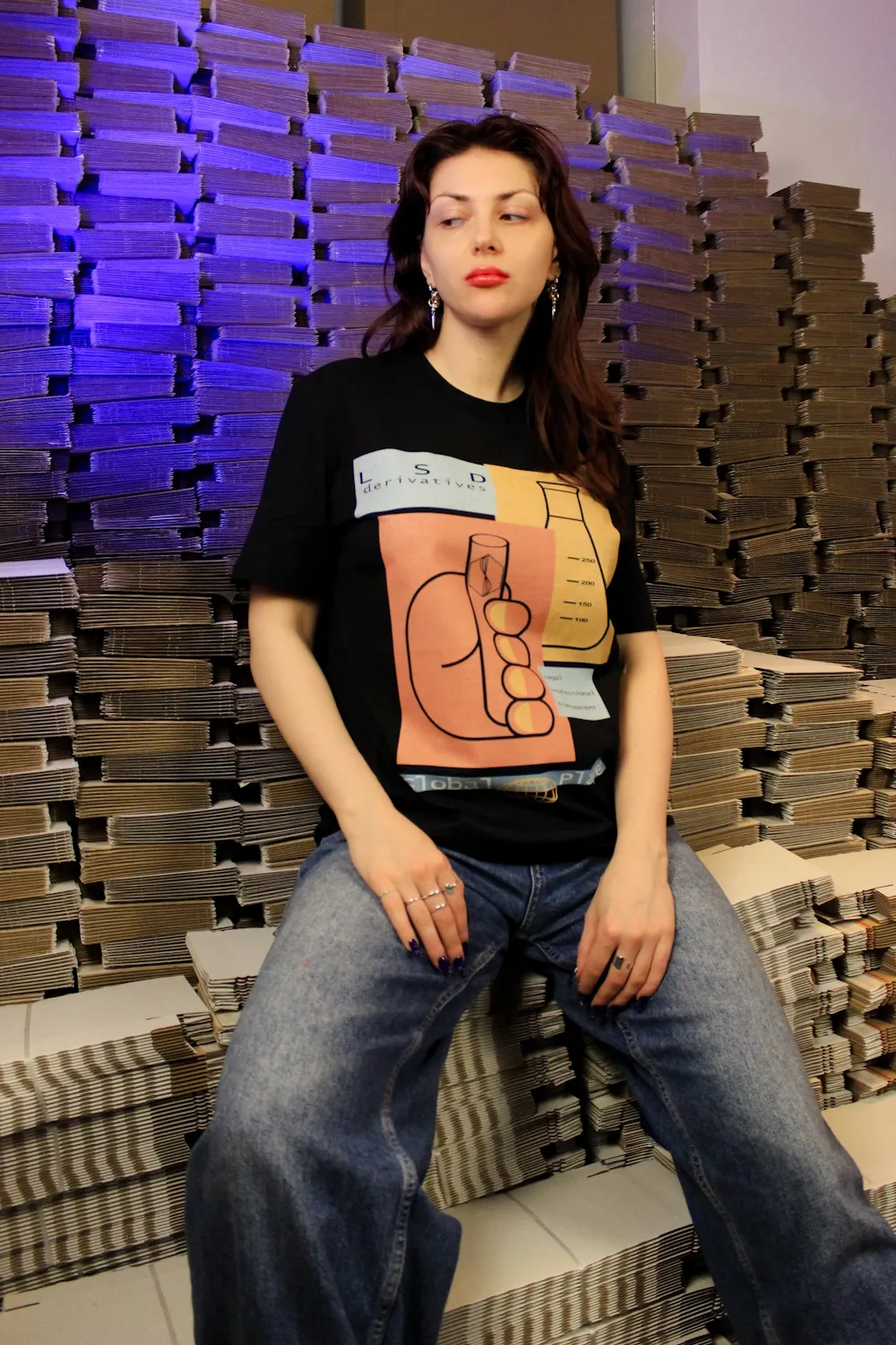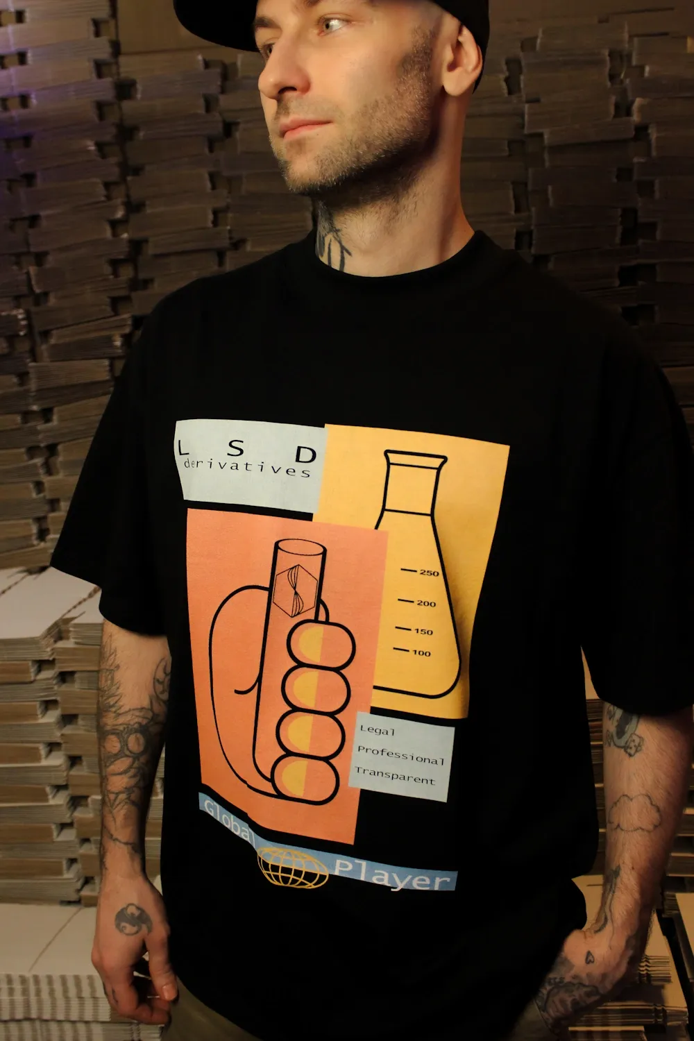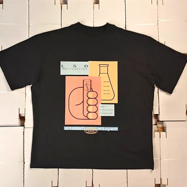 Dieses bunte und kantige Design bringt unsere Mission auf den Punkt: Mit Motiven von Reagenzgläsern und Kolben steht es für die professionelle Forschung an LSD-Derivaten.